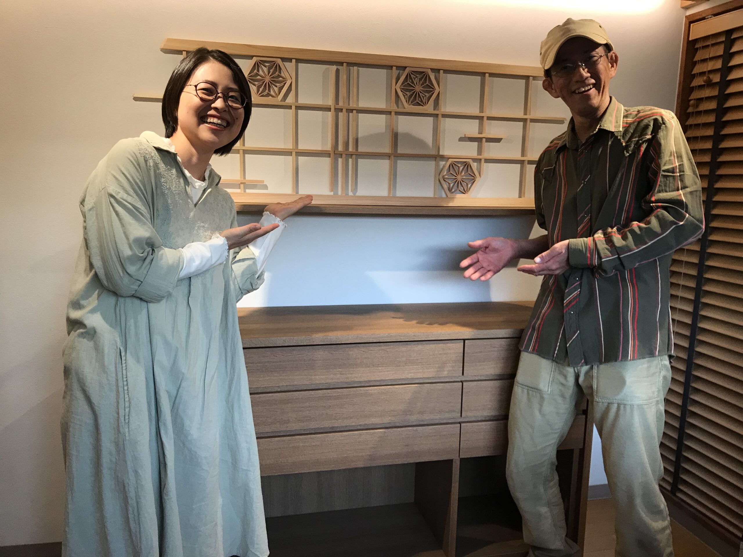 こだわりの方とタッグを組んで作った「壁面組子細工」です。基本設計は私がしたのですが、出来上がった組子細工は、打合せの都度変化して、やっとできました。取付には奥様も来られ楽しい時間をもてました。