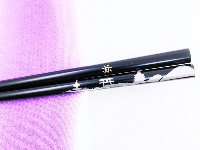 お箸の絵柄は、左から京都タワー・平安神宮の鳥居・八坂の塔そして東山へとつづきます。