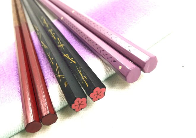左から「根来八角箸(7mm)」 「松竹梅六角箸(8mm)」 「藤刺繍八角(9mm)」