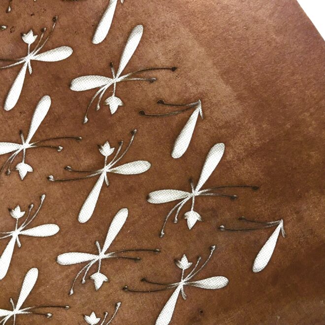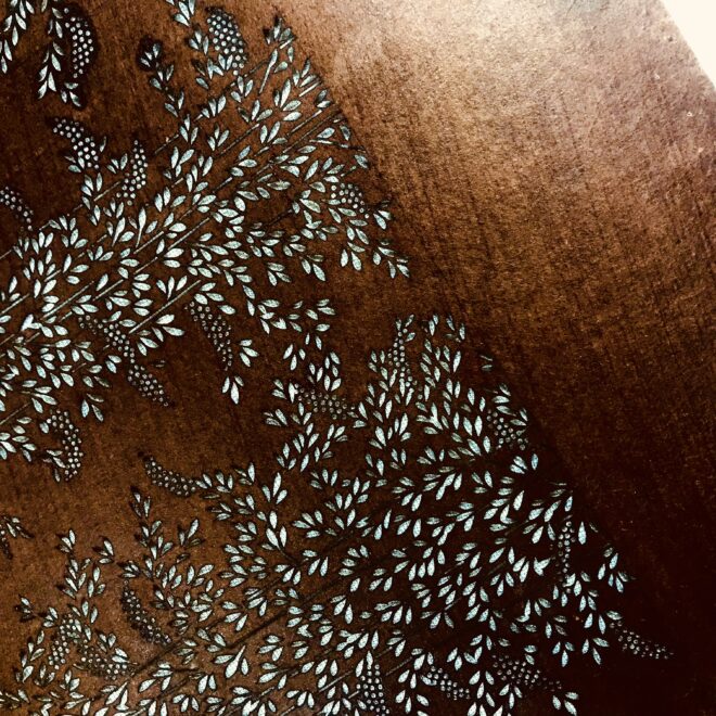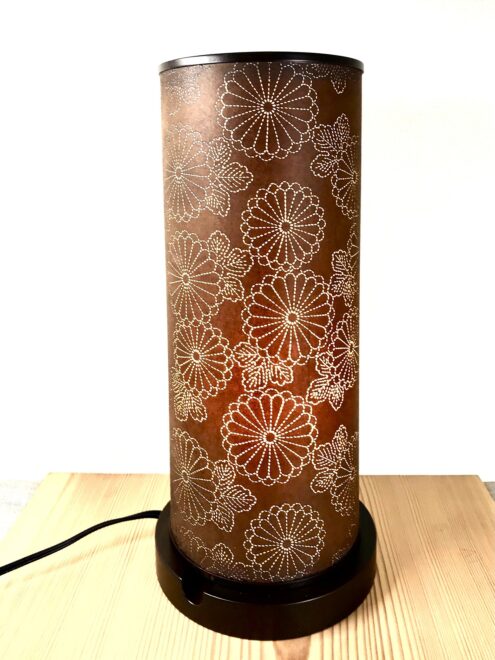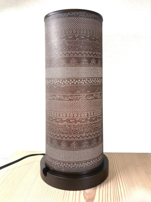 伊勢型紙とは、着物の生地を柄や紋様に染色するために使われる型紙の一つである。友人のご主人が友禅の着物デザイナーで、この伊勢型紙を一部に使い京友禅をデザイン制作されていました。ご主人がなくなり、友人がこの型紙を使って何かに再生したいという想いから、行燈の制作を発想され、箸や楓にも相談がありました。