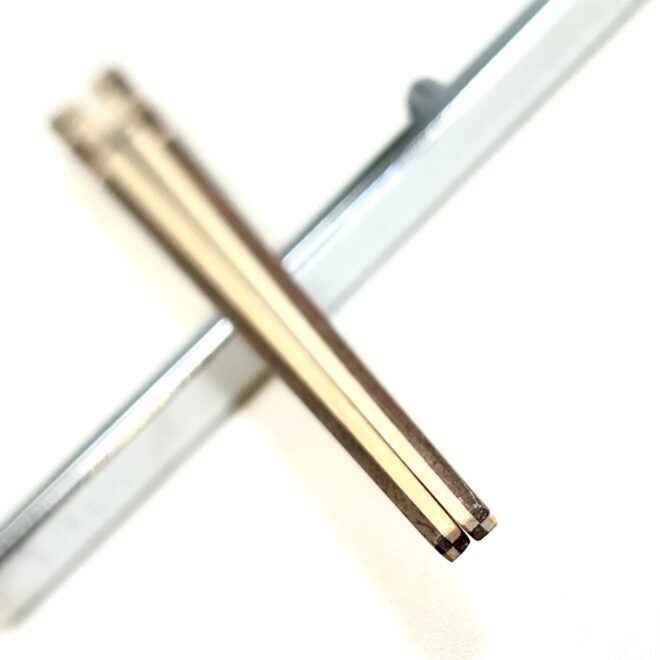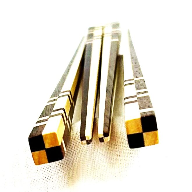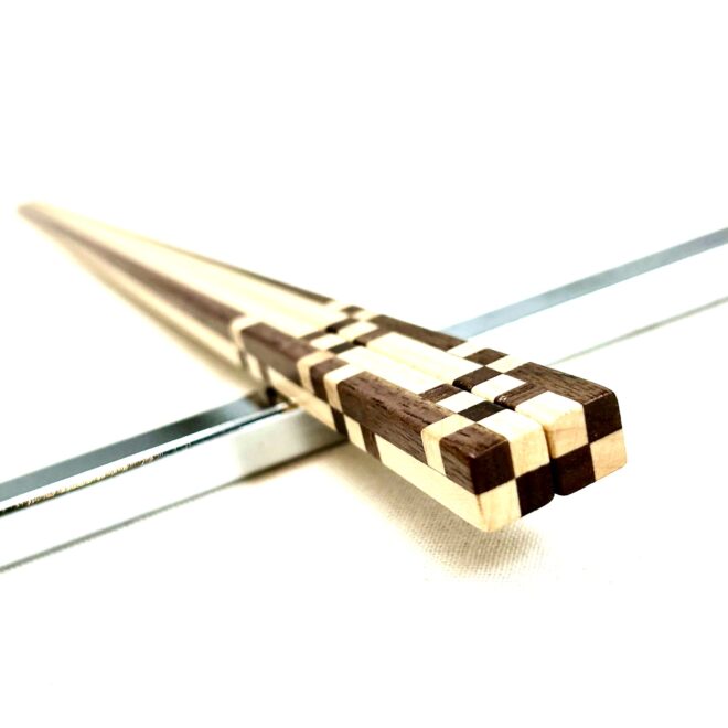 このコースターは旭川の上地さんに頂いたもので、レジカウンターの上に置いていました。毎日この視覚で見ていると、その美しさに触れ、特別なアイデアが芽生えました。その結果、市松模様が施された6㎜角・長さ30cmの角棒を4本製作し、楽しい寄木箸が誕生しました。寄木箸の特徴は、持ち手だけでなく箸先部分もこだわりが詰まっています。箸先は4本の木で組まれ、十字部分がきっちりセンターに来るように削り出されています。国産の木を中心に使用し、樺の木やくるみ材などの色彩豊かな素材が調和し、洗練されたデザインが生まれました。