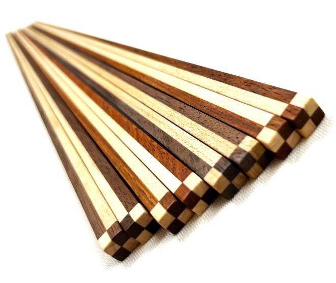 箸や楓の寄木箸は、コースターから生まれた長い寄木でつくる耐久性のあるお箸です。