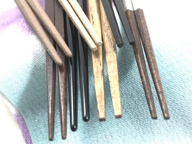 毎日手にする箸ですが、ほとんどの方が自分専用の箸をお持ちになっていると思います。ところが、その箸が愛用の逸品と言える方がどれくらいおられるでしょうか。日本には、素材そして形や色。麺や納豆などの食材に対応した箸があります。また子供の頃から専用の箸があり、両親の箸、兄弟の箸そして自分の箸と、個人の道具として小さなころから意識をしてきました。このように大切な道具なのに、大人になってからも親やが選んでくれた、或いは友人がプレゼントしてくれた箸を何気なく使っている人がほとんどです。靴は足のサイズにあわせて買いますが、お箸はどうなのでしょうか。手だって人によって大きさや厚みが違います。自分専用の道具なのに、意識して手にあわせて箸を選んでいる方はとても少ないように思います。最低限、初めにお箸を持った時に違和感ない箸を使うべきです。