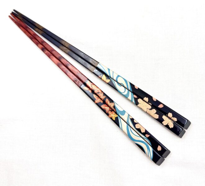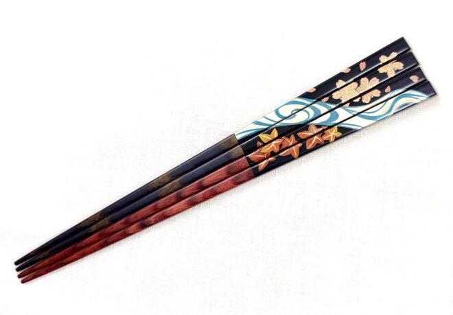 よりそい箸に、自然の情景を描いた「流水と桜・紅葉」のデザインを施しました。この箸は、黒漆の落ち着いた背景に、流れる水の様子を大胆に表現し、その左右に桜と紅葉を配置することで、春と秋の美しい景色を一対の箸に収めています。