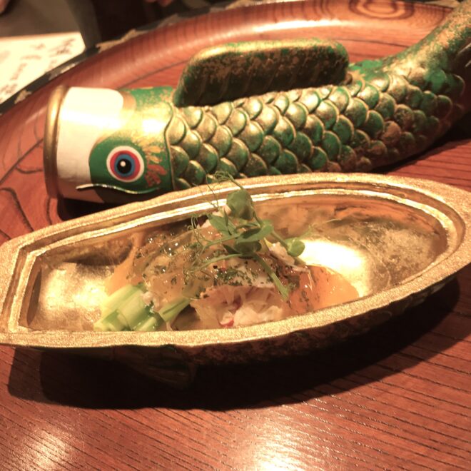 八寸は端午の節句ですかね、奥のガラス小々鉢に翡翠豆に粽、葉形皿に車海老にわらびとあやめ茶巾、唐墨に鯛のすり身団子かな、そして下の皿に手作り厚揚げ。菖蒲が邪気払いで、兜は、お子様を危険から守り、安全に暮らせるようにとの願いが込められた装飾品ですかね。 一皿に込められた料理を目で楽しみ、舌で味わい日本の文化を学ぶという事ですかね。楽しくいただけました。