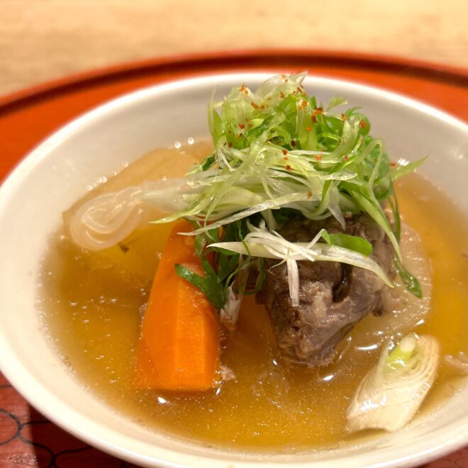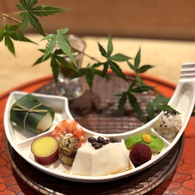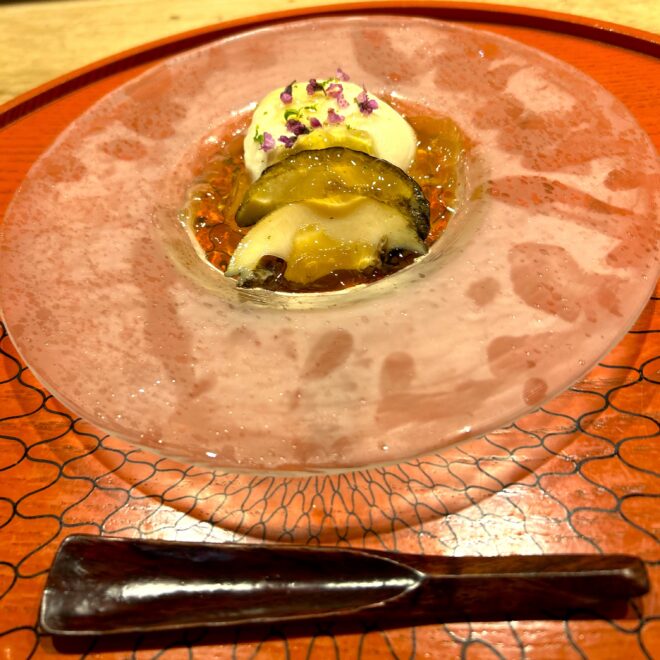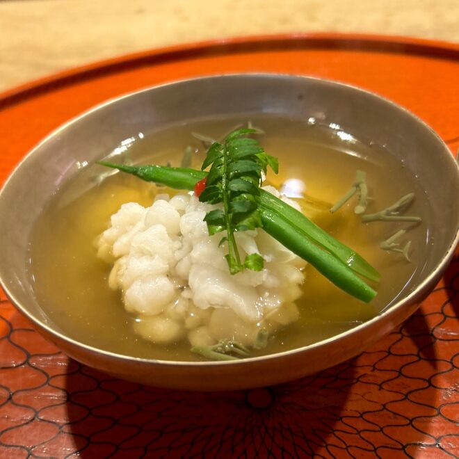 まずは、初夏の訪れを感じさせる前菜からスタートしました。ジャガイモのムースに花穂紫蘇を添えた一品と、アワビのゼリー寄せ。春の名残と初夏の爽やかさが絶妙に調和した逸品です。続いては、鱧の椀盛です。鱧は初夏を象徴する食材の一つで、上品な味わいが季節を感じさせてくれます。