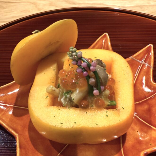 最初の一皿は、柿の器に盛られた美しい先付。中にはイクラの艶やかな朱が散りばめられ、秋の実りをそのまま閉じ込めたよう。器は紅葉の形をした皿、まるで“秋そのもの”が食卓に降りてきたかのようでした。