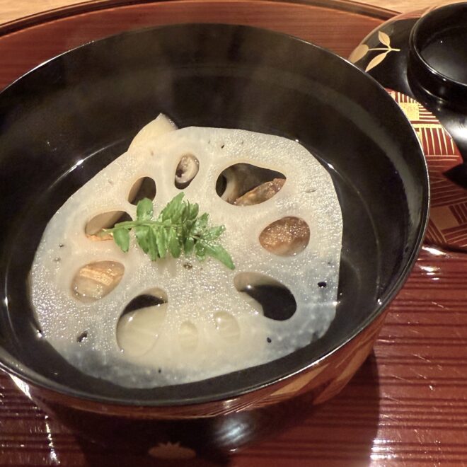 椀物は、透き通る出汁に蓮根を浮かべた一品。蓮根の白と香り高い出汁の組み合わせが、心を静かに落ち着かせてくれます。蓋を開けた瞬間に立ちのぼる湯気が、まるで秋の朝霧のようでした。