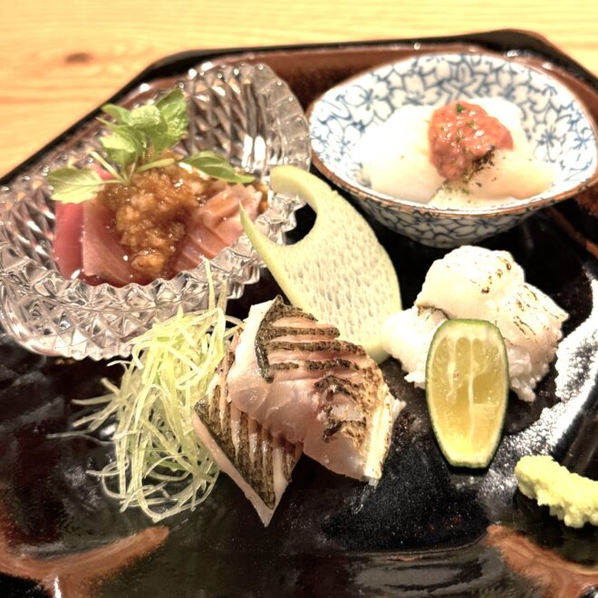 お造りは、鯛、鰹、ハモなど旬の魚がそれぞれの表情で登場。繊細な包丁仕事と盛り付けの美しさに、思わず見とれてしまうほど。どの魚も旨味が際立ち、器の上に小さな海の景色が広がっていました。