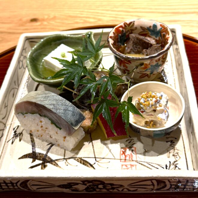 続く八寸では、鯖寿司や胡麻豆腐、白和えなど、京都らしい手仕事が光ります。錦秋のもみじが添えられた器の上で、季節の彩りが重なり合い、一品一品に職人の遊び心が感じられました。