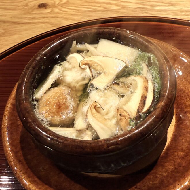 土鍋から立ち上る松茸の香りに包まれた秋の主役です。松茸と鶏つくねの旨味が出汁に溶け込み、思わず箸が止まらなくなる一品でした。