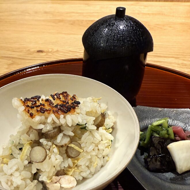 締めは香ばしいおこげが香るご飯。山の幸とともに炊かれたご飯の優しい味わいが、コース全体を穏やかに締めくくってくれます。