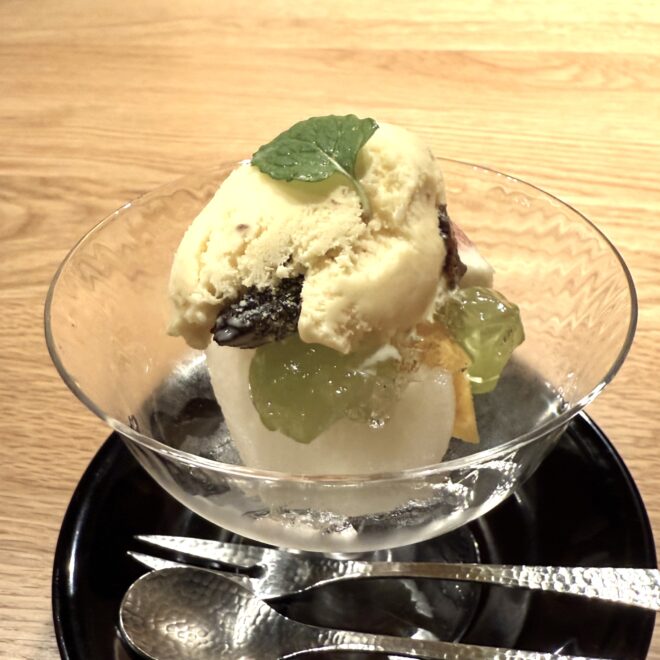 そしてデザートには、和の要素を感じるアイスクリーム。果実や寒天が彩りを添え、食後の余韻を静かに整えてくれました。