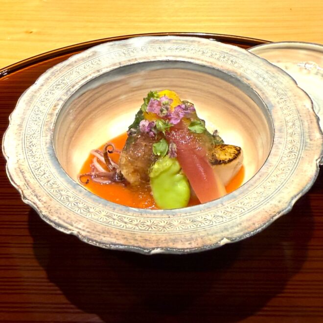 はじめの一品は、軽く炙った魚に旬の野菜や花びらがあしらわれ、ほのかな酸味の効いたソースが全体をまとめ、見た目の華やかさと味の一体感が際立ちます。