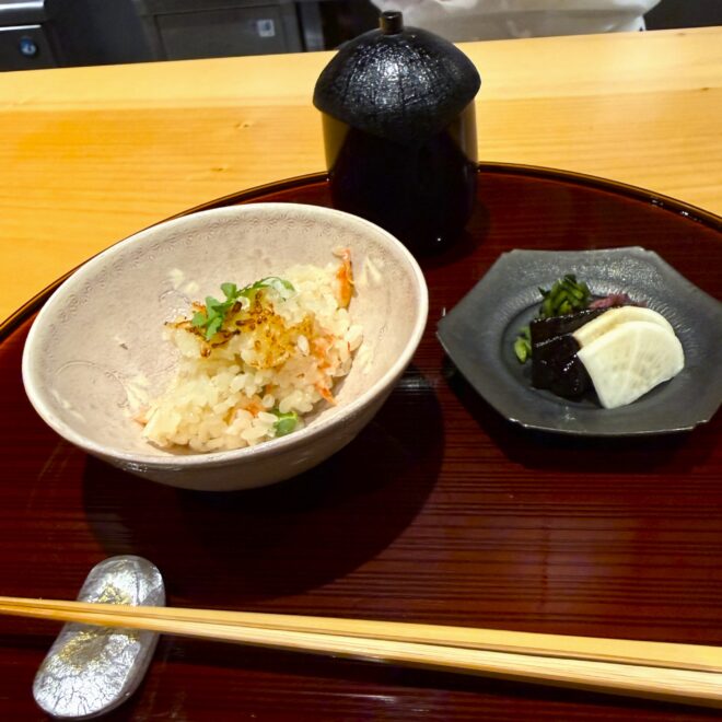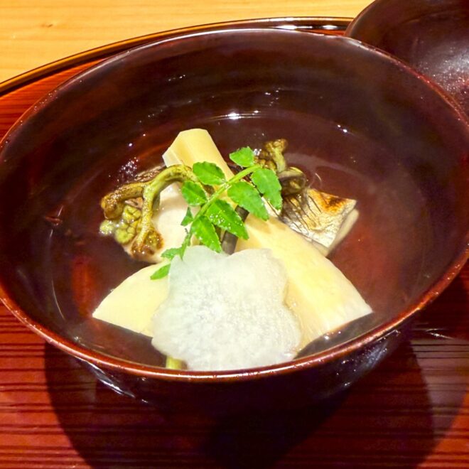 続く椀物は、焼き目を入れた魚に筍や山菜が添えられ、澄んだ出汁の中でそれぞれの香りと旨味が引き立ち、春の気配を感じさせる優しい味わいでした。