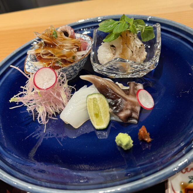 お造りは、身の締まったイカや貝に加え、薬味や柑橘を添えることで、さっぱりとした中にも奥行きのある味わいに仕上げられています。