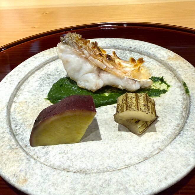 焼き物では、ふっくらと火入れされた魚に、香ばしく焼いた筍や甘みのある芋が添えられ、素材そのものの力強さを感じさせます。