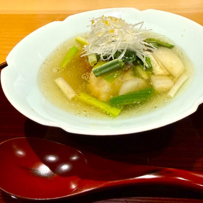 さらに温かい一皿では、やわらかな具材に青みの野菜や白髪葱が合わせられ、滋味深い出汁とともに身体に染み入る味わいに仕上がっていました。
