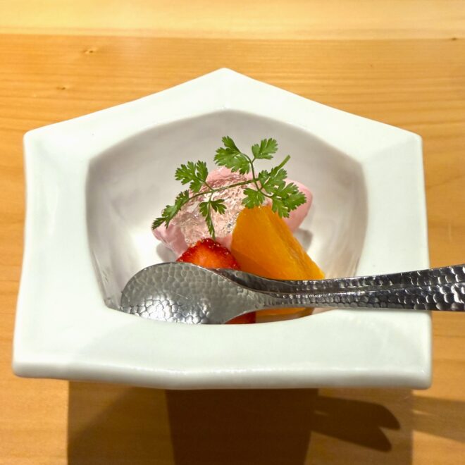 甘味には、苺や柑橘を添えたやさしい甘さの一皿が用意され、食後の余韻を穏やかに締めくくってくれます。