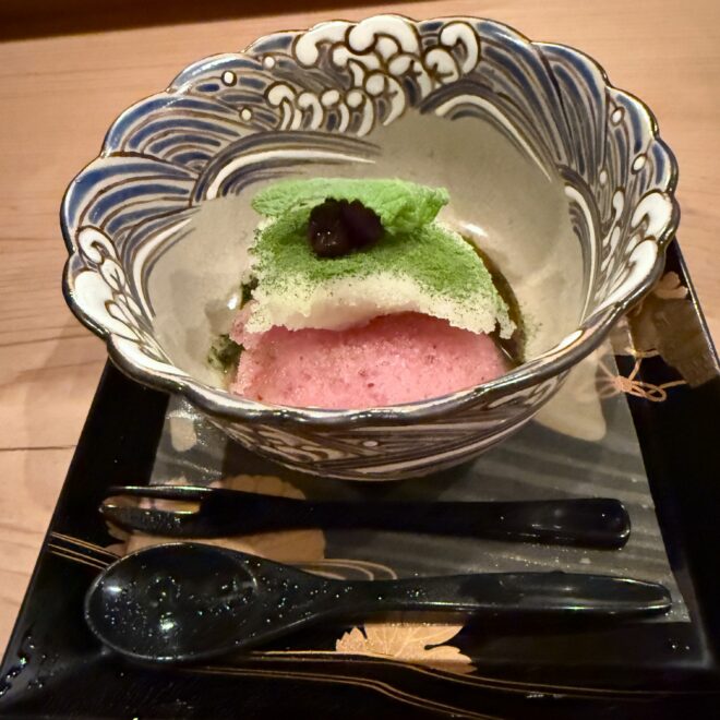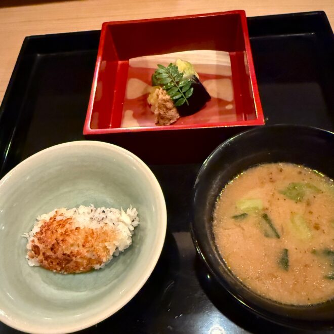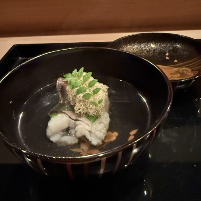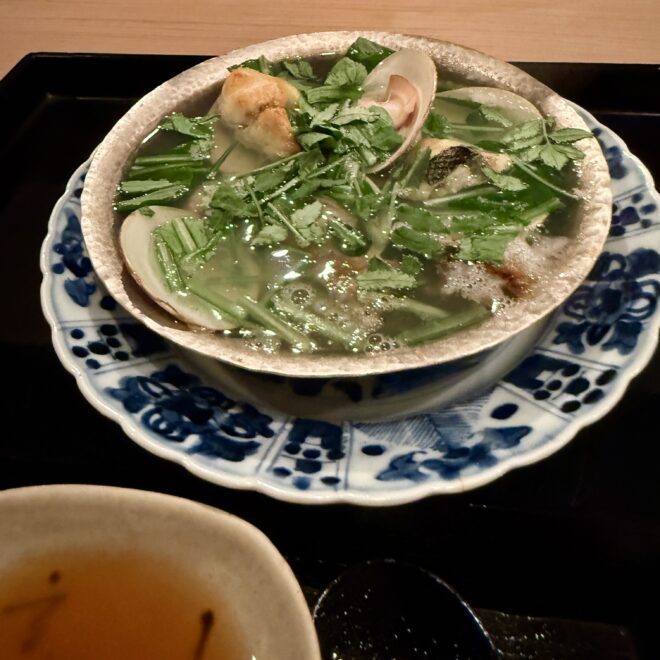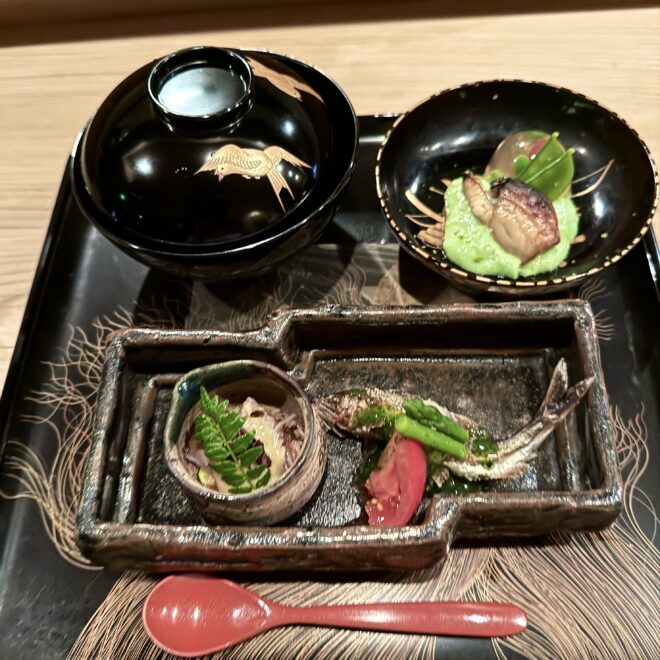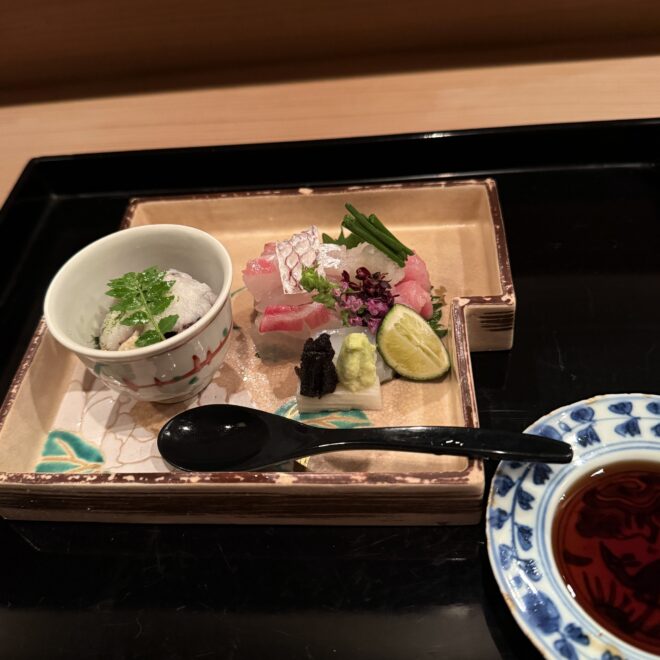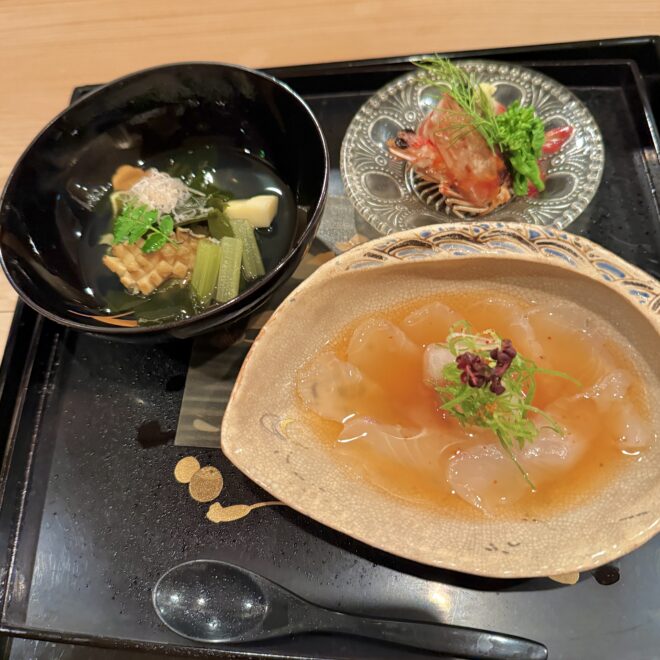 先日訪れた割烹での食事は、料理の創意工夫と繊細な感性に満ちた、まさに記憶に残る体験でした。それも、一の膳・二の膳というのでしょうかボリュームがあり、見た目からは想像できない素材の組み合わせが、驚きと感動そして楽しさを感じさせてくれました。使われている素材は奇をてらわず、その味わいは理屈抜きで心に響くものでした。料理には季節感が丁寧に表現されており、香りや食感、盛り付けに至るまで、五感を通じて旬を楽しめる構成でした。また、器にも強いこだわりが感じられ、料理との調和が視覚的な喜びを高めていました。特に印象的だったのは、意外性に頼らず確かな「おいしさ」を軸に組み立てられたバランス感覚で、大将の抑制された美意識が伝わってきました。